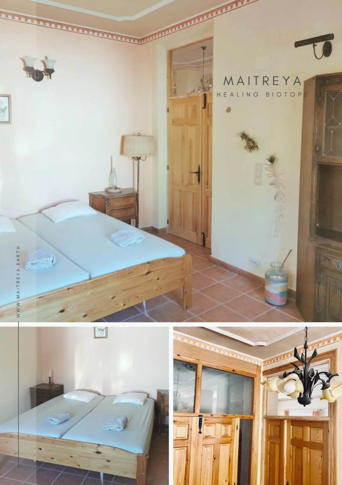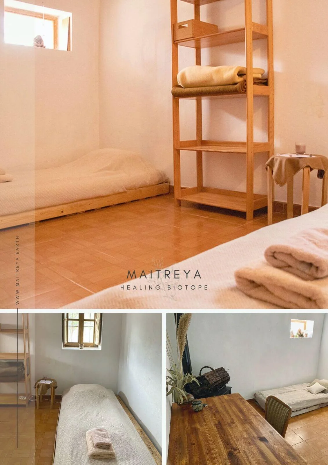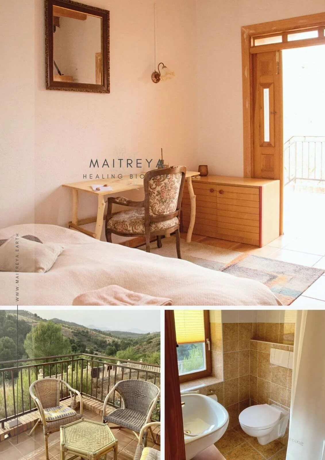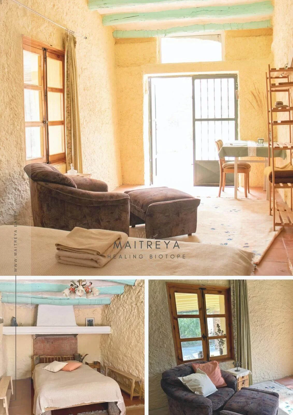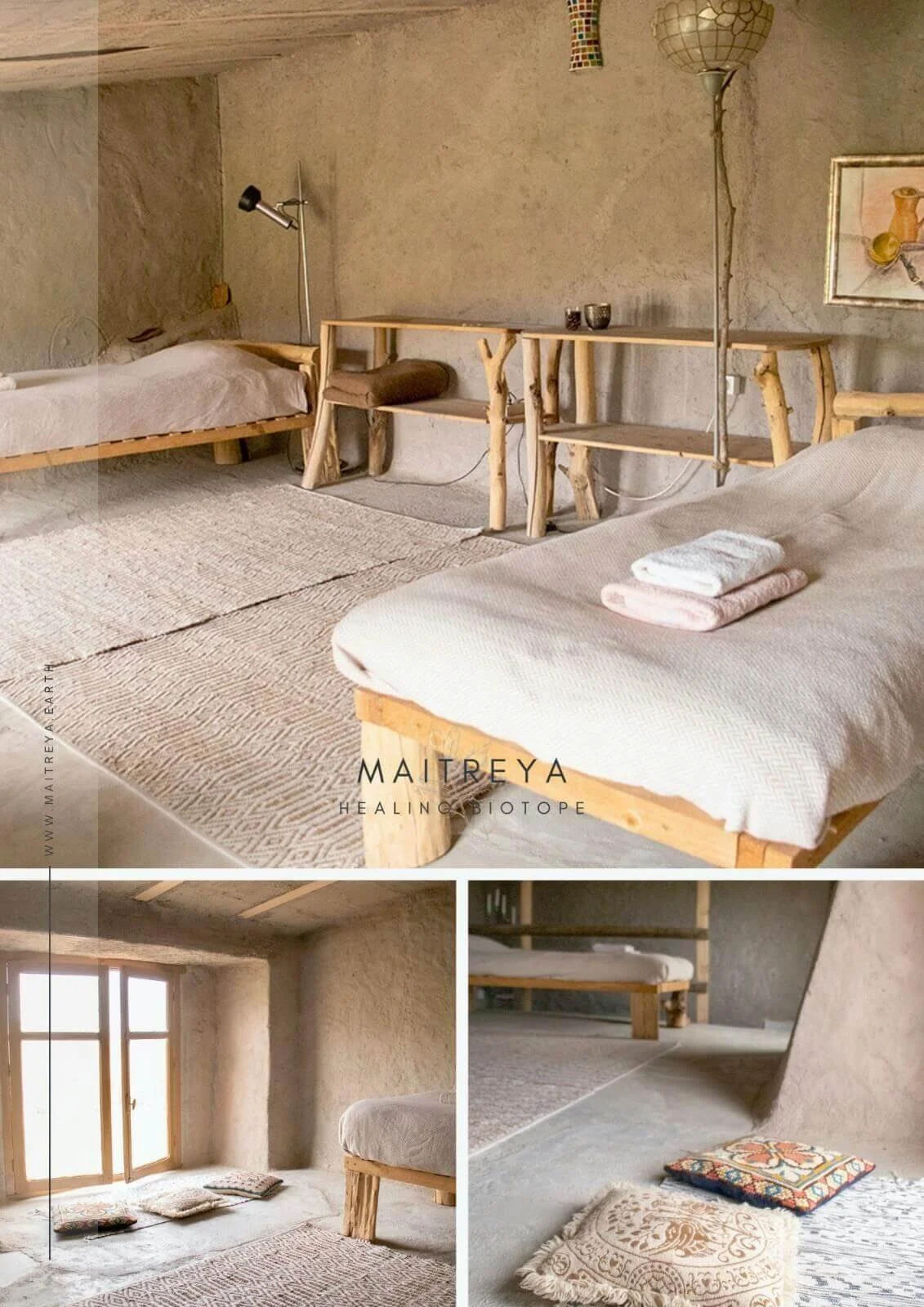 Maitreya offers a direct experience of oneness—simply by watching the sun set behind the mountains, counting falling stars, and listening to the sounds of hundreds of different birds and animals. It’s a harmonious fusion of rough stones and towering trees with the soft breeze and delicate almond blossoms.